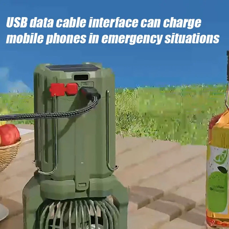 SOLAR-POWERED EFFICIENCY – Harness sunlight with the built-in solar panel for eco-friendly charging! Rechargeable battery stores energy for 8-12 hours of light or fan use. No cords, no hassle—perfect for camping, patios, or emergencies. Sustainable power meets off-grid convenience!